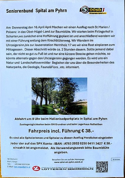 Beschreibung: Wir fahren nach St.Marien / Polsenz in das Obst-Hügel-Land zur Baumblütte. Starten beim Firlingerhof in Scharten, wo zunächst eine Hofführung geplant ist und anschließend wandern wir mit einer Führung entlang des Kirschblüttenweges.